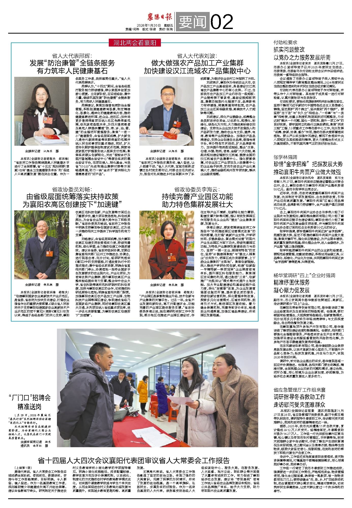 刘波建议,深化产业链融合,统筹整合各类财政涉农资金,以优质化、规模化、标准化、绿色化为方向,大力推进高标准农田建设。支持龙头企业加大技术改造投入和产品研发力度,推动农业与文旅、康养、电商、教育等产业深度融合。加强农产品品牌建设,支持企业创建自主品牌,做强电商平台,举办特色节庆活动,扩大品牌影响力。加快提升物流枢纽能级,整合“交易、仓储、冷链、物流、信息、金融”六大功能,高起点规划建设辐射汉江流域、链接全国的汉江流域农产品集散中心。强化要素保障,对农业加工产业项目及入驻集散中心的企业给予扶持,定向引进农业产业化高端人才,推动金融机构开发专项贷款,解决企业融资难题。