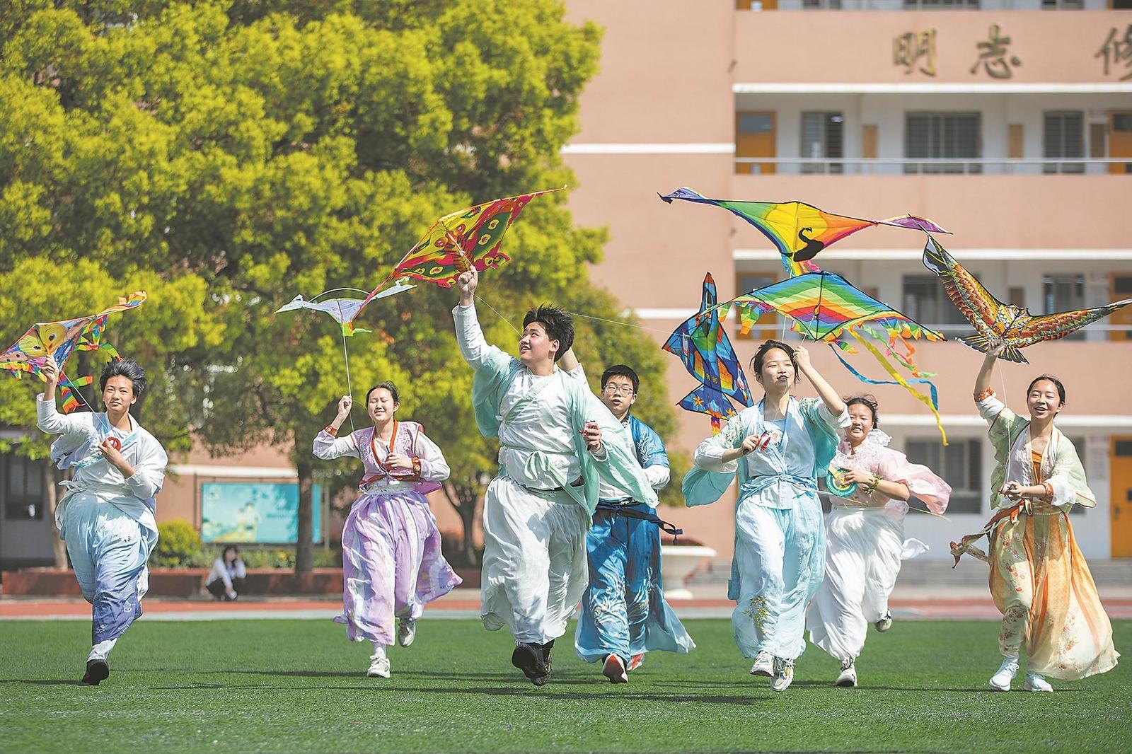 4月1日,市诸葛亮中学开展清明节主题实践活动。学生们身着汉服,参与编柳帽、放风筝等民俗体验活动。