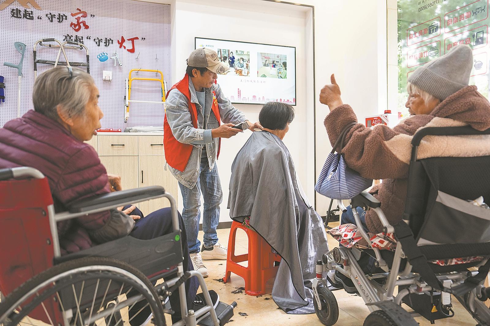 在长沙市望城区高塘岭街道湘陵社区,志愿者为老年人和残疾人士免费理发(2025年11月6日摄)。新华社 发