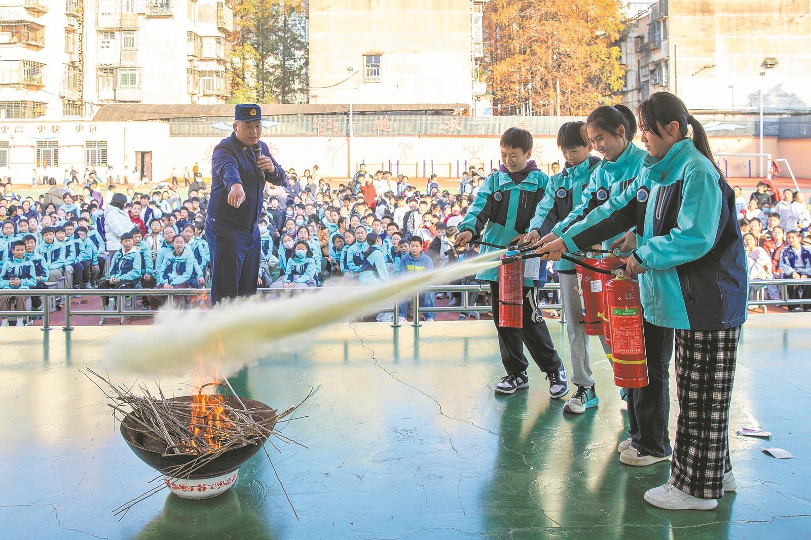 11月28日,在市三十九中,学生们在消防员指导下进行灭火演练。当天,该校开展消防演练活动,通过知识讲解、器材操作与实战演练,全面提升学生们的火灾避险与自救互救能力。