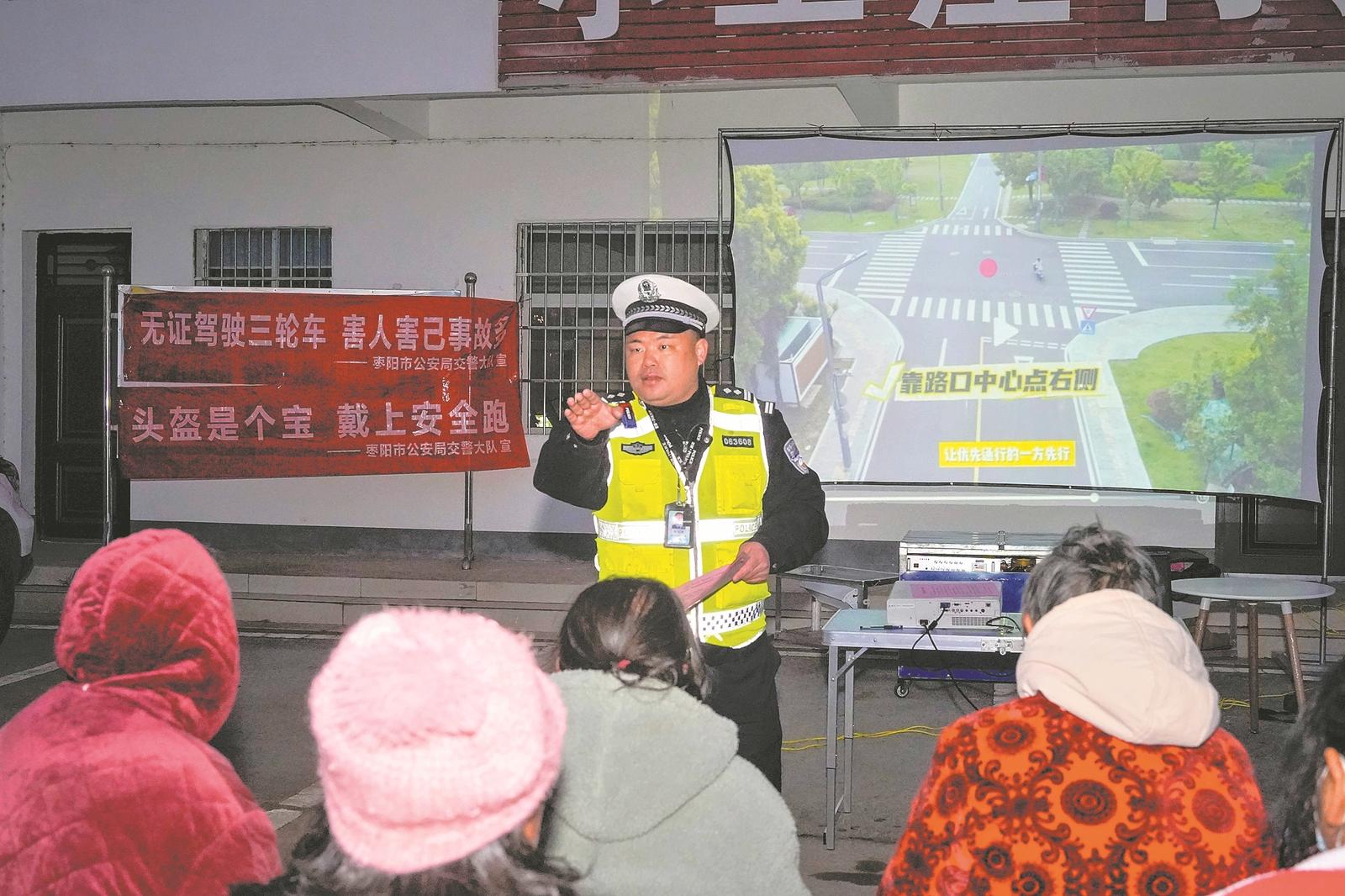 “走,去村广场看电影,还有交通安全知识!”11月19日傍晚,枣阳市鹿头镇小王庄村的广播一响,村民们拎着小马扎就往村委会赶。广场上,杨文闻和同事早已架好设备,准备播放交通安全警示教育片。