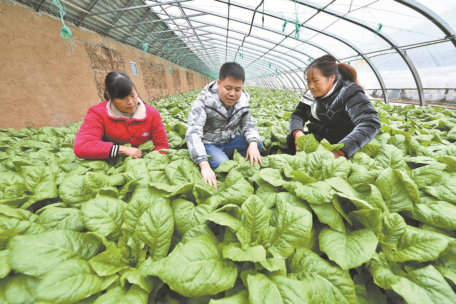 12月12日,在保康县寺坪镇庹家坪村蔬菜种植基地,保康县农业农村局农技人员(中)为菜农讲解蔬菜防寒管理技术。