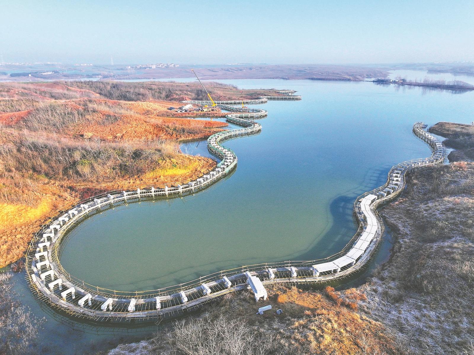 12月25日,工人在普陀堰水库加紧建设水上景观栈道。