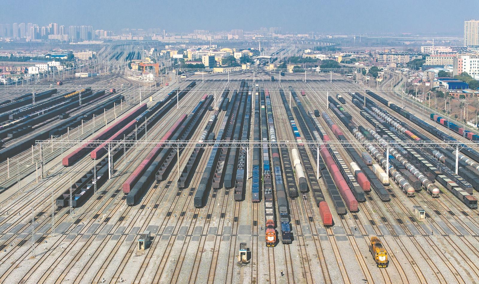 1月9日,大量货车在襄阳北车站编组场整装待发。