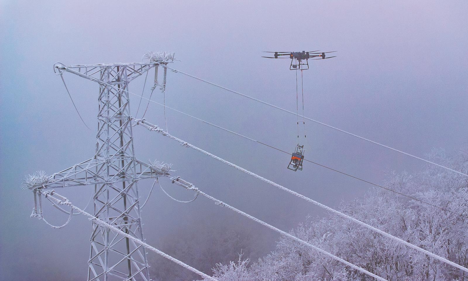 1月20日,在保康县后坪镇蜡烛山村,110千伏翁天一回42-43号塔导线上方,国网襄阳供电公司输电运检分公司工作人员操作无人机将完成工作的除冰机器人吊离作业区。