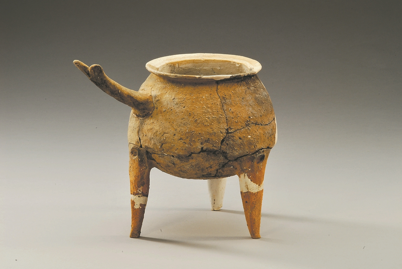 老鸹仓遗址出土的带把罐形陶鼎。