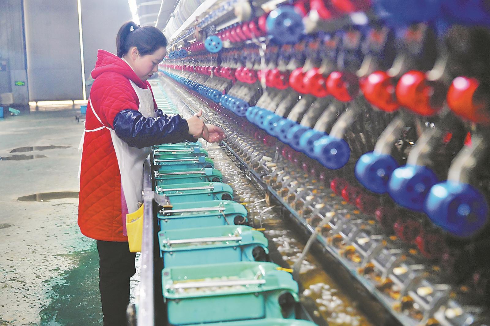 1月28日,在南漳楚桑丝绸文化博览园生产区的缫丝车间里,工人操作机器剥茧、抽丝,全力赶制订单产品。