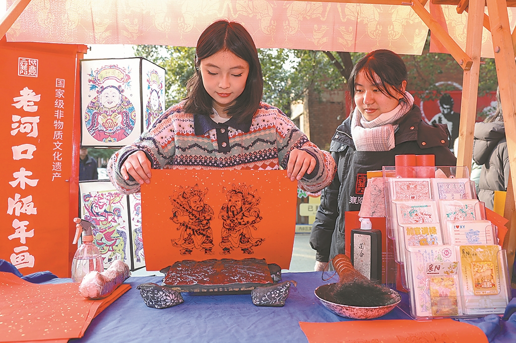 2月7日,市民在六〇三文创园体验国家级非物质文化遗产老河口木版年画制作。