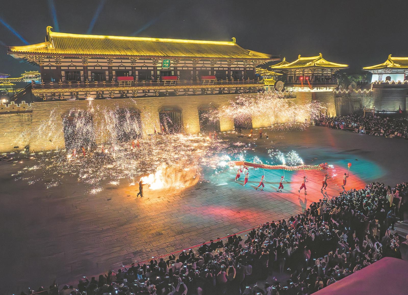 2月19日,游客在盛世唐城景区观看“火龙钢花”和“火壶”表演。全媒体首席记者 杨东 通讯员 何梦琴 摄