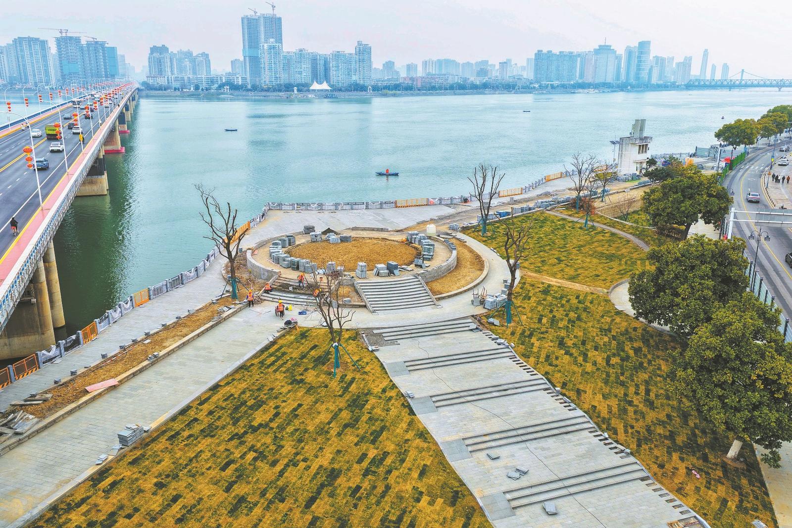 3月4日,工人正对滨江大道北侧的绿化景观进行改造施工。此次改造将通过优化绿化布局,使景观视线更加通透,同时完善便民设施,进一步提升市民的休闲体验。 记者 谢勇 摄