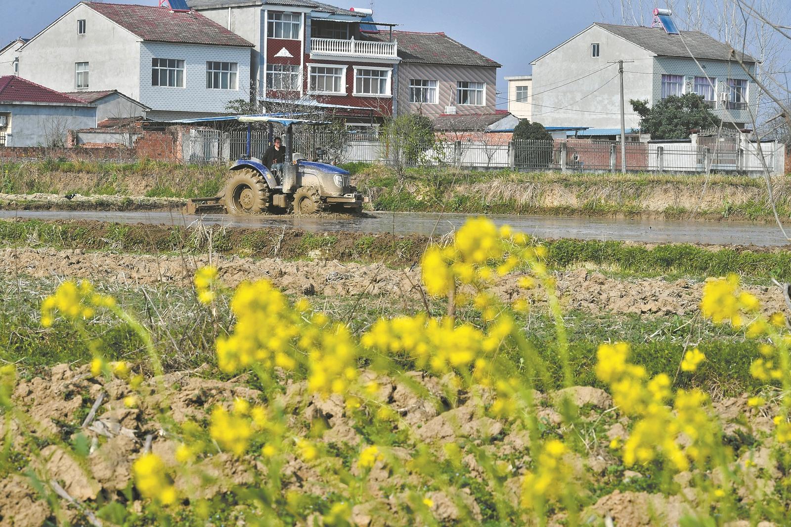 3月10日,在南漳县九集镇泉水堰村,农机手驾驶拖拉机翻耕水田,为水稻育秧做准备。春回大地,万物复苏,人们在田野上忙着春耕备耕,播种希望。