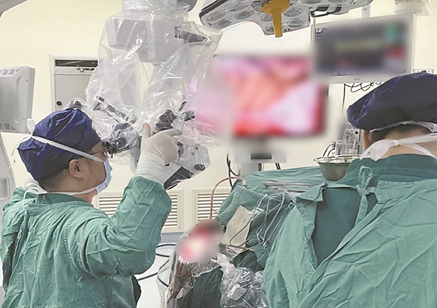 手术团队为患者实施全麻下颅内微型柔性皮层电极置入辅助颞叶癫痫切除手术。