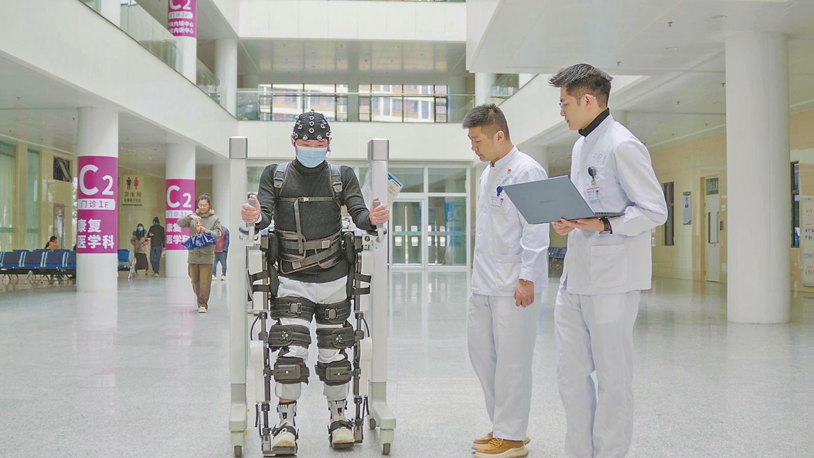 患者穿戴脑机接口外骨骼设备,在医护人员指导下进行智能康复步行训练。