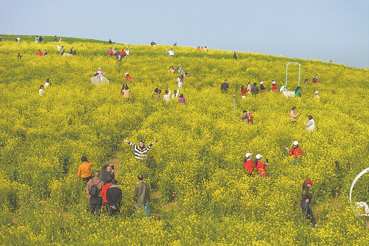 日前,在樊城“一号公路”两旁,金黄色的油菜花连成一片,引来游人漫步花海,打卡拍照。