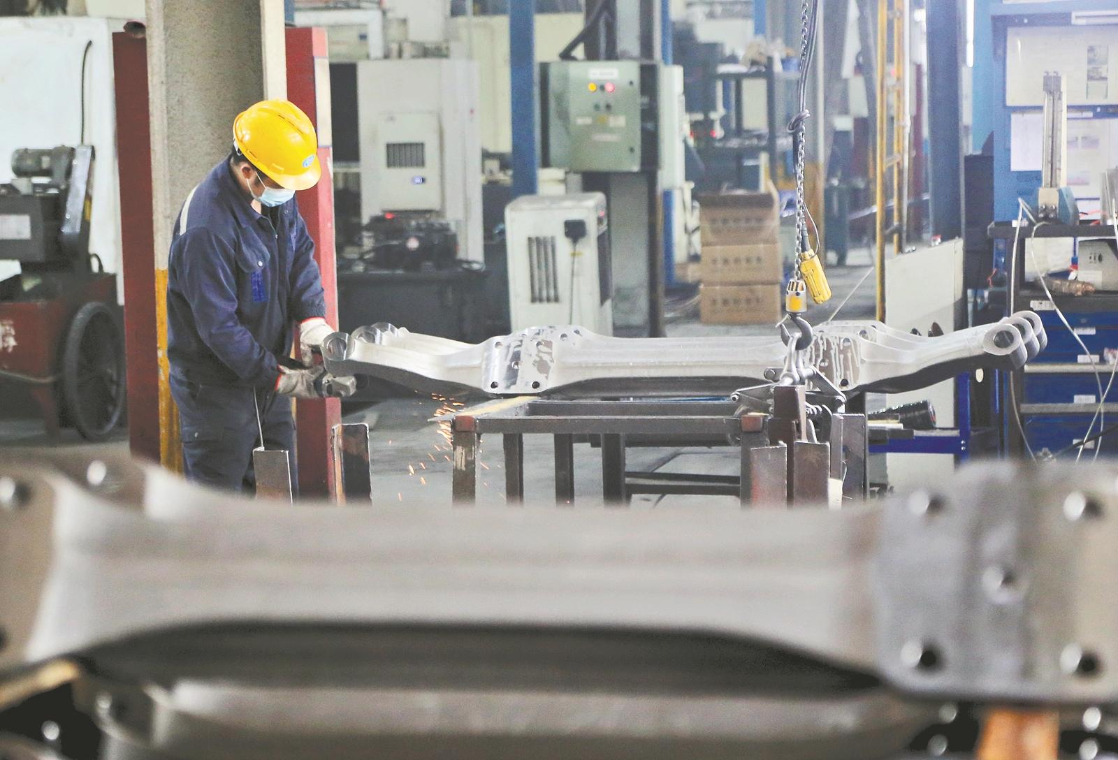 湖北三环车桥有限公司工人打磨汽车前轴产品。记者 童光辉 摄