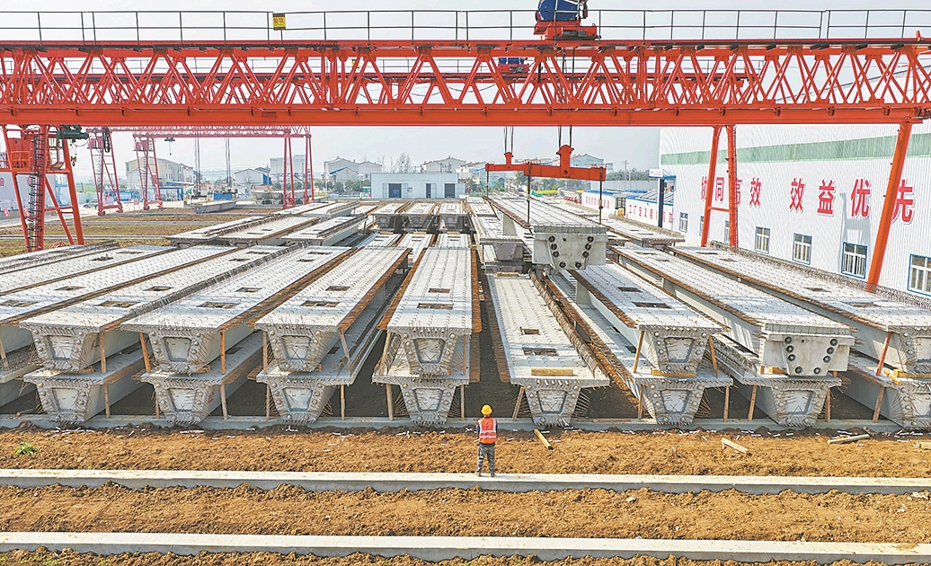 3月25日,工人在中铁上海工程局襄新高速襄阳段项目智慧梁场生产预制梁。