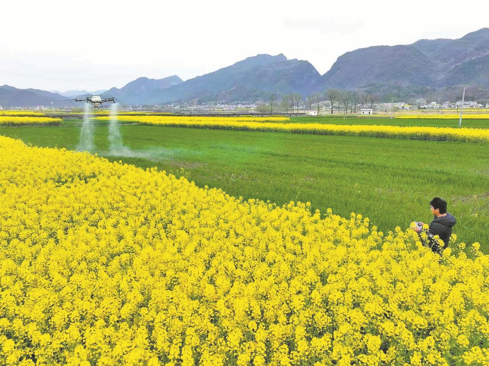 在马良镇潮水村,连片的小麦青翠欲滴、油菜花迎风摇曳。植保无人机腾空而起,在大田上平稳穿梭,均匀地将药液喷洒在作物上,整个过程快捷高效。