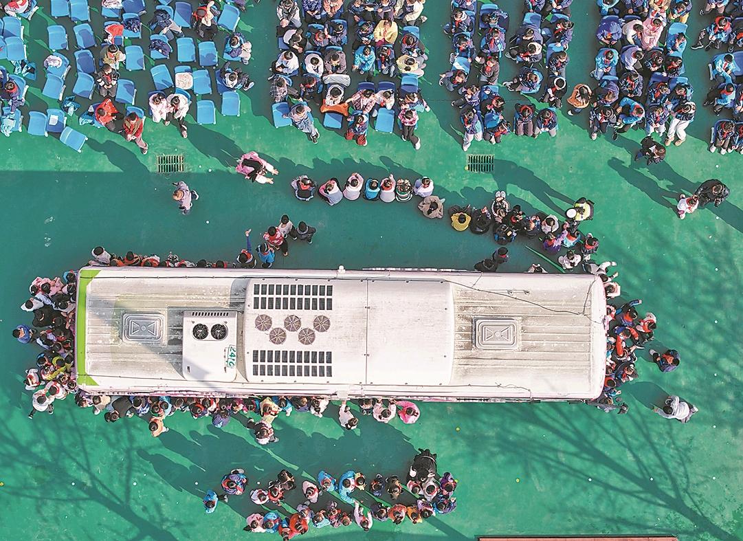 4月1日,民警为小学师生讲解公交车盲区、大车内轮差等交通安全知识。