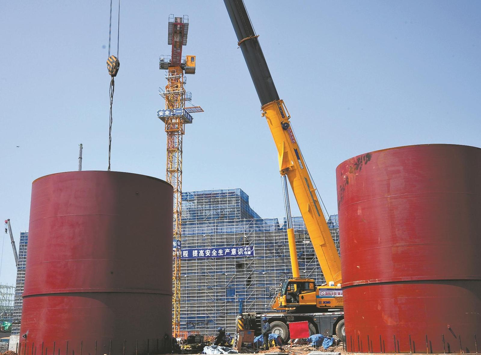 4月1日,工人在位于谷城经济开发区的兴发保谷磷化工产业园一期项目建设现场作业。