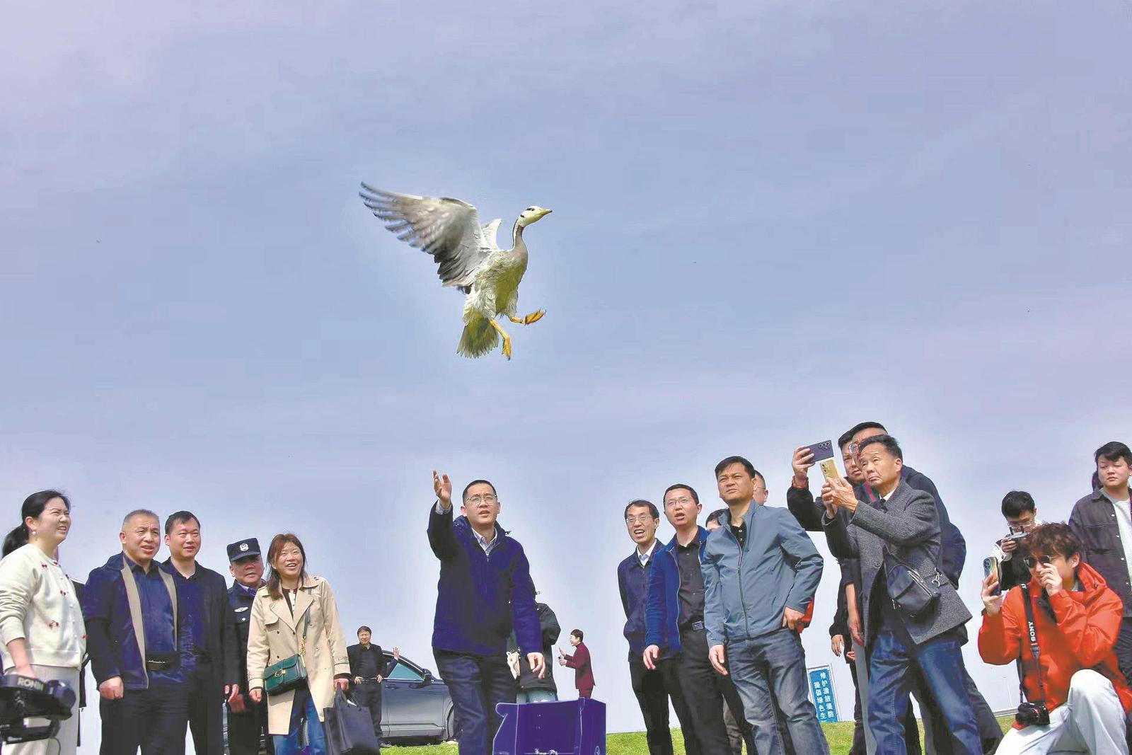 活动现场,经救护康复的黑鹳、雁鸭类、猛禽等野生动物被放归自然,同时开展湿地保护科普宣传,呼吁公众守护飞羽精灵,共绘生态画卷。