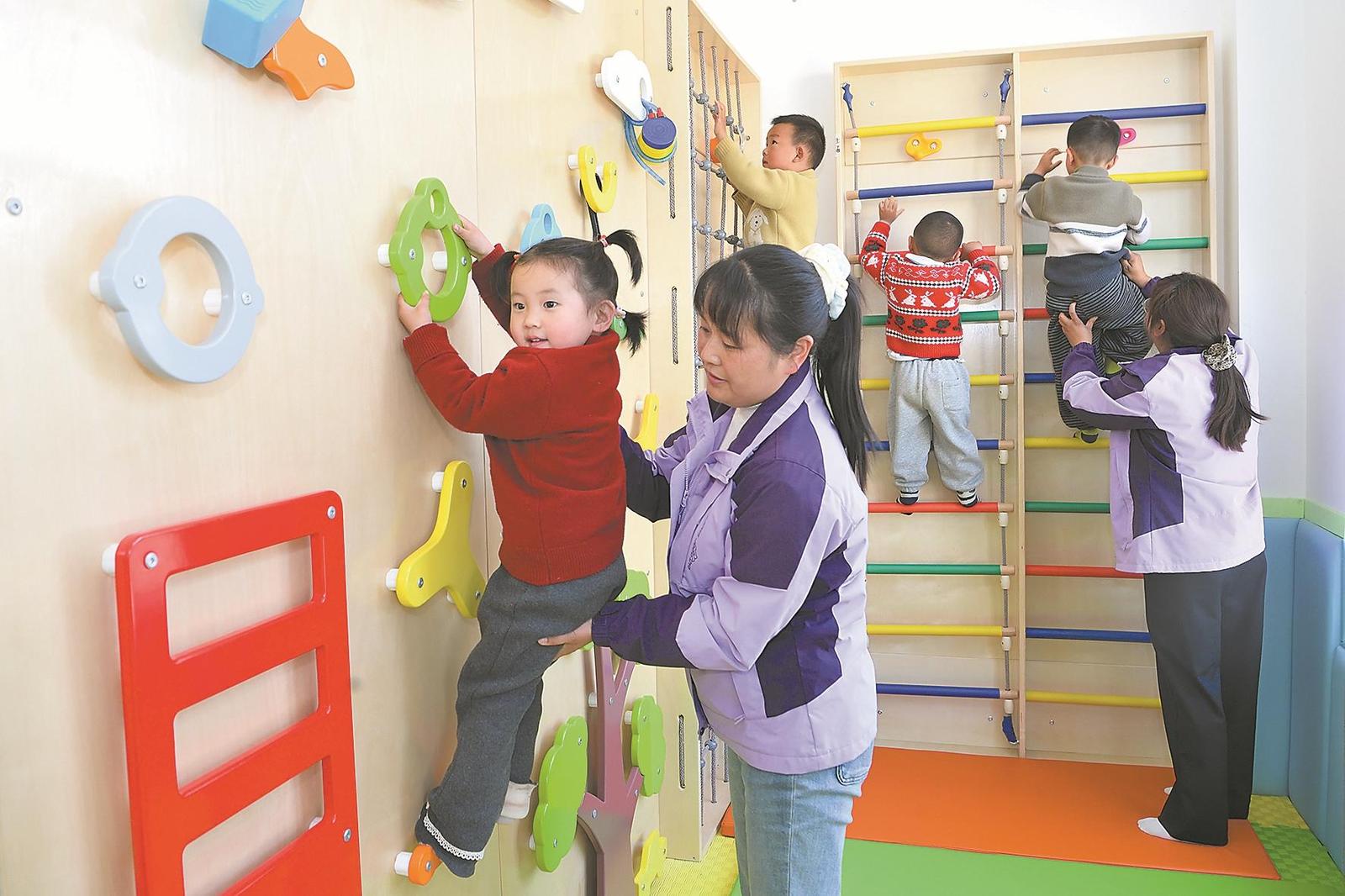 4月1日,在保康县歇马镇中心幼儿园托育班,小朋友在老师的陪伴下进行攀爬锻炼。