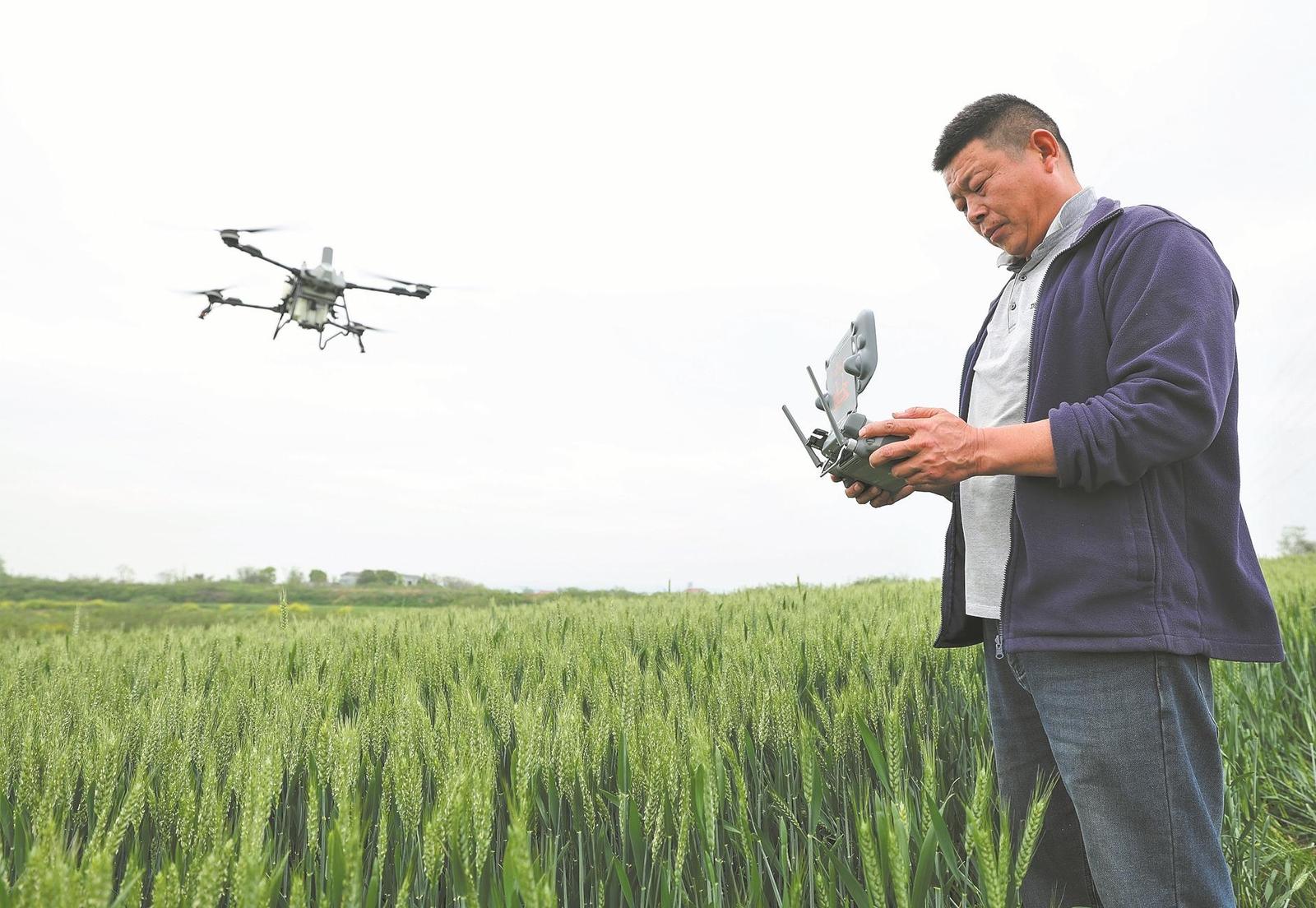 4月7日,在襄城区尹集乡木桥村,一家种植专业合作社的社员操作植保无人机对小麦进行“一喷三防”作业。