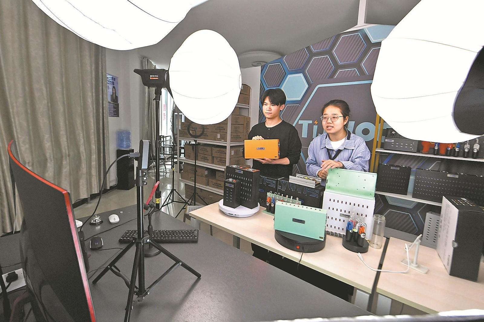 4月14日,襄城区尹集乡襄水电商产业园内,工作人员正直播带货,进行跨境电商选品上架。