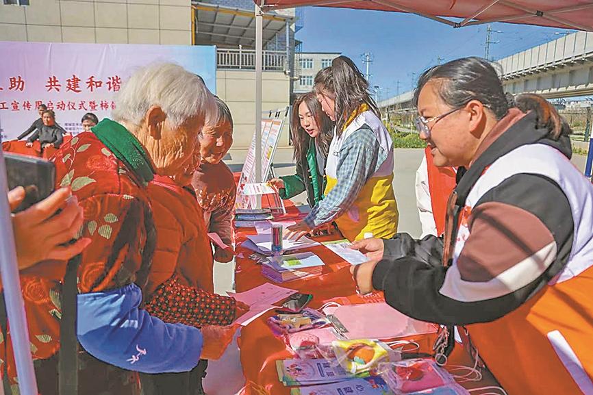 近日,在樊城区社工宣传周启动仪式上,志愿者为社区老人宣传政策法规。