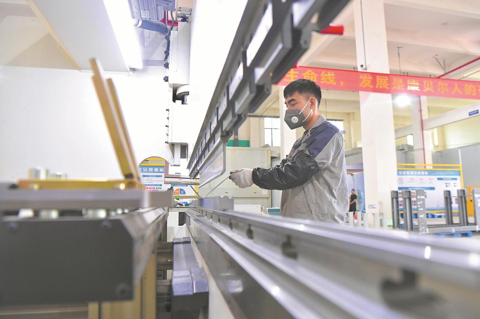 4月13日,在东津新区襄阳康贝尔智能装备有限公司生产车间,工人正熟练操作精密仪器,一条条智能生产线设备有序组装下线,即将交付客户。