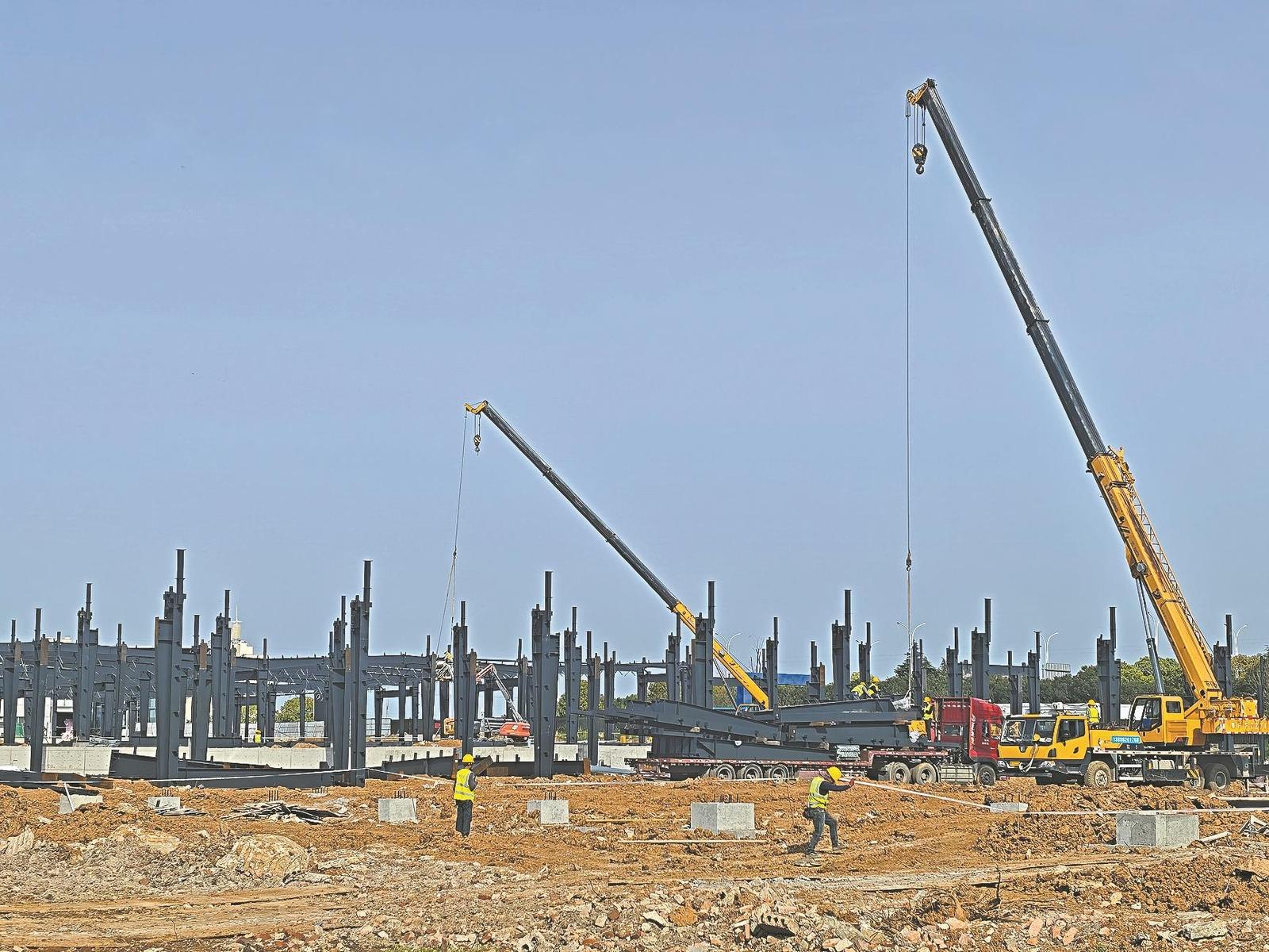 近日,在襄州区新能源汽车销售长廊项目施工现场,工人们加紧推进钢结构施工。