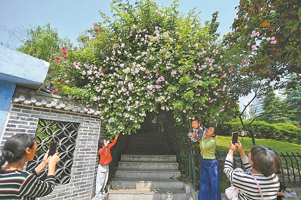 4月19日,市民在樊城区新华公园的月季花廊前拍照。目前,月季已进入盛花期,花团锦簇,甚是美丽,引得往来市民驻足欣赏。